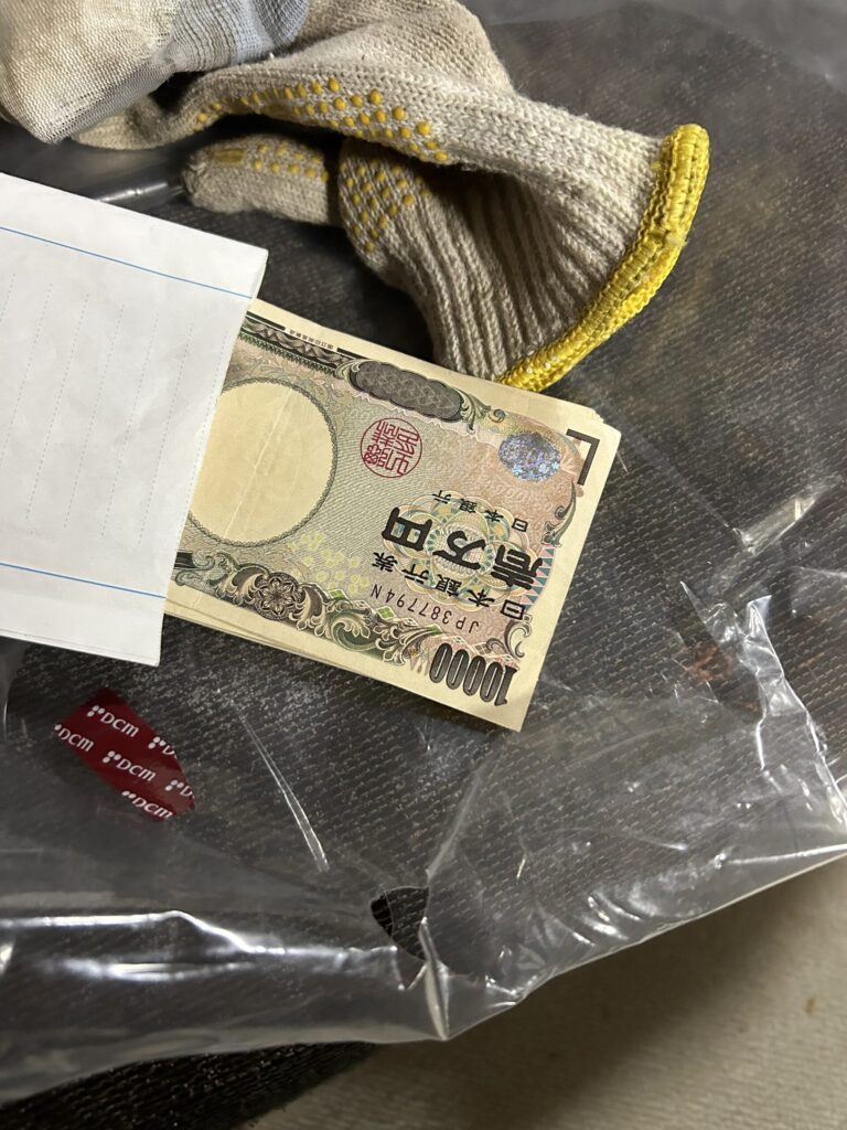 - 作業中に棚の裏から現金26万円を発見し、お客様へご返却